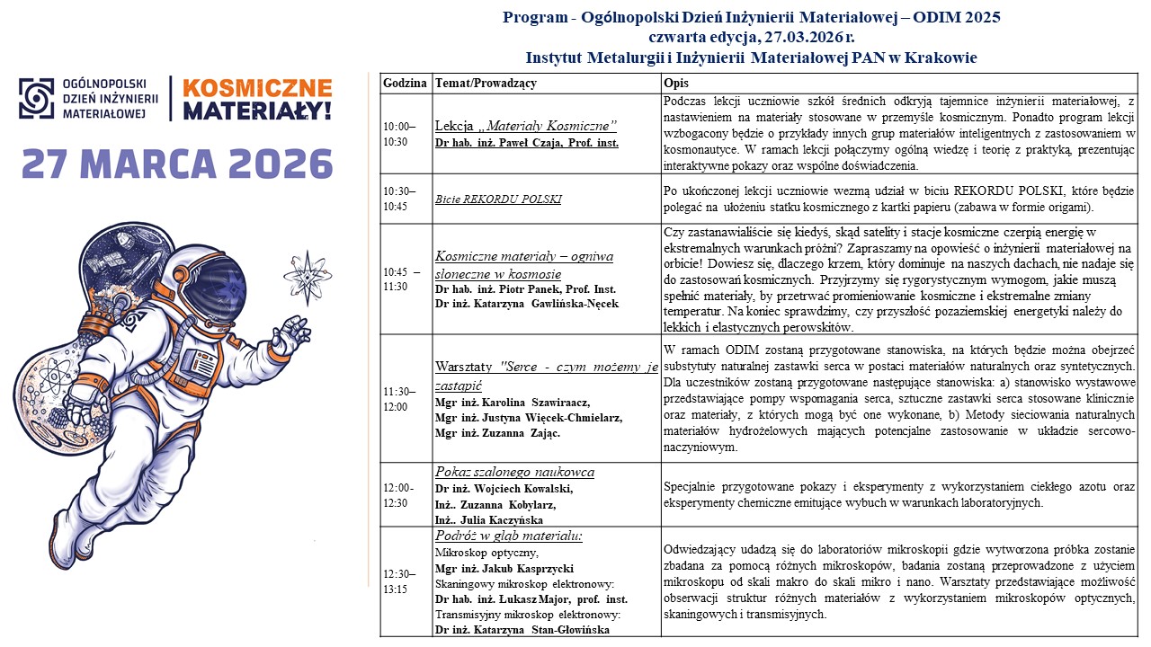 Ogólnopolski Dzień Inżynierii Materiałowej (ODIM) 2026 to inicjatywa popularyzująca naukę o materiałach, organizowana przez uczelnie i instytuty badawcze w całej Polsce. Wydarzenie odbędzie się 27 marca 2026r. i obejmuje wykłady, warsztaty oraz pokazy laboratoryjne prezentujące nowoczesne materiały i ich zastosowania. Tegoroczna edycja odbywa się pod hasłem „Kosmiczne materiały".